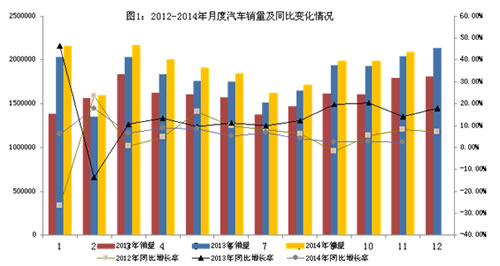 2014年11月,汽车产销双双超过200万辆,月度产销基本保持较快增长。2014年1~11月,我国汽车产销超过2100万辆,同比分别增长7.2%和6.1%。 一、11月汽车产业整体保持平稳增长 据中国汽车工业协会统计,11月全国汽车产销分别为216.07万辆和209.09万辆,产销同比分别增长1.2%和2.3%;产销环比分别增长5.7%和5.2%。 1~11月,汽车产销分别为2143.05万辆和2107.91万辆,同比累计增长7.2%和6.1%,产销增幅较去年同期分别下降7.14和7.43个百分点。