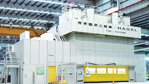 近日,由中国通用技术集团齐齐哈尔二机床(集团)有限责任公司与德国哈格自动化公司合作开发的高端重型2500吨多工位自动冲压生产线在广东福迪汽车有限公司宣布研制成功。同时交付用户的还有800吨落料自动化生产线,另一条3200吨多工位自动冲压生产线正在调试中。 该生产线应用于汽车薄板冲压零件的全自动高效加工,具有自主知识产权,各主要技术参数、性能指标达到国内领先、国际先进水平,已被列为国家“高档数控机床与基础制造装备”科技重大专项项目,堪称汽车冲压设备的一次变革,对实现国内汽车装备业的跨越式发展具有重要意义。 在当日的活动庆典上,工信部装备司副司长王卫明表示,齐二机床着眼中国汽车工业发展形势,把企业责任与国家汽车工业发展相联系,产品发展与市场需求相结合,积极消化吸收国外先进技术,为汽车领域用户提供了全套解决方案,很有价值。 强强联合 共铸世界顶级冲压线 由于70%以上的零件都由压力机冲压生产,汽车产品的质量与产能,主要取决于压力机的水平档次。近年来,我国汽车工业发展迅猛,产量逐年攀升,车型变化日益加快,对冲压生产工艺也提出了更高的要求。 目前,我国的冲压零件大多经由多台压机和多副模具后才成形,即由“串联冲压线”完成,既有手动生产也有自动生产,典型的节拍为每分钟4~8个零件。与之相比,多工位自动冲压生产线具有自动化、高速化、复合化、制件质量高且稳定等诸多优势,充分体现了当今世界冲压装备的发展趋势和最高水平,并已成为世界著名汽车厂商的首选设备和高档汽车覆盖件的必备装备。