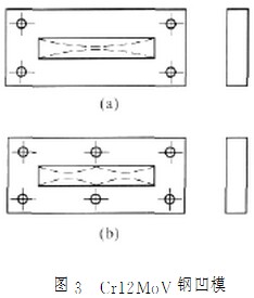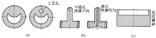 (2)适当增加工艺孔 对于有些实在无法保证截面均匀及对称的模具,应在不影响使用性能的前提下,变不通孔为通孔,或者适当增加一些工艺孔。 图3a所示为一型腔狭窄的凹模,淬火后会产生如虚线所示的变形。如设计时能增加2个工艺孔(如图3b所示),则减小了淬火过程中截面的温差,降低了热应力,使变形情况有了明显的改善。 图4所示也是增加工艺孔或变不通孔为通孔的实例,可减小因厚薄不均而增大的开裂敏感性。
