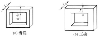 (1)尽量避免尖角和厚薄相差悬殊的截面
