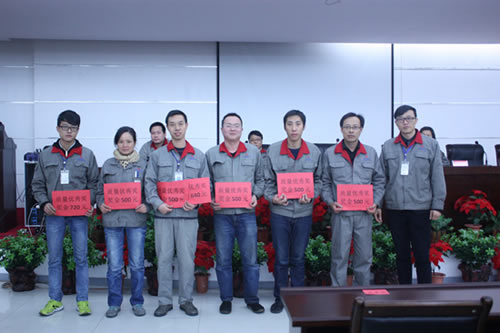 2014年12月4日晚,江鑫公司11月份表彰大会在行政楼五楼大会议室隆重举行,总经理、各中心负责人、先进团队、先进个人及广大职工参加了本次表彰大会。 首先,技术副总宣读表彰令,他表明11月公司在全体员工的共同努力下,在团队合作、技术研发、质量管控方面取得了不错的成绩,涌现出了较多无私奉献、努力拼搏的先进个人和团队。他希望获奖团队与个人要珍惜荣誉,坚定信念,再接再厉。 接下来,公司总经理为本次大会作了简要总结,他充分肯定了获奖团队与个人的辛苦付出,更提出了下阶段的工作要求,他重点强调了团队合作的重要性,更要求全体员工向优秀个人和先进团队学习,在年前的这一两个月中紧密配合,团结一心,以确保公司持续稳定的发展并且不断的突破创新! 本次表彰大会共颁发4个奖项: 积极配合奖 设备保养优秀奖 技术研发奖 质量优秀奖: