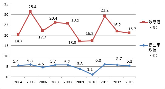 调研结果可以帮助企业将自身财务及经营状况与行业平均水平对标。被调企业还可将自身情况与优秀企业(这些企业均达到既定指标的90%)和利润最好的企业(具有最高平均盈利能力的企业)做比较。 二、销售额和连续参加调研的企业 同往年比较,销售额是否有所增长?为此,PMA针对连续参加调研企业的进行了跟踪统计。在2012年、2013年连续参加调研的企业共计60家,2013年累计的销售额为23亿美元,比2012年的21亿美元增长了近10%。 三、行业利润 调研以息税前利润(EBIT)做为企业盈利能力的指标,把该指标作为公司的营业收入。除了受金融危机影响的2008和2009年,在过去的十年内,平均息税前利润始终占到销售额的5%-6%, 同期盈利最好的企业的平均EBIT的占比在13%到25%之间。(图2)