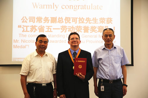 2014年5月27日上午,受江苏省总工会的委托,武进区总工会主席蒋亚诚、武进区总工会副主席唐国贤,生产保护部部长徐波、武进高新区工会主席吴允超一行四人来到江苏龙城精锻有限公司,为我公司法国籍常务副总倪可拉先生颁发江苏省“五一劳动荣誉奖章”和荣誉证书。龙城精锻党支部书记庄龙兴、工会主席时晓东出席了授牌仪式。 首先,区总工会蒋主席对常务副总倪可拉获奖表示衷心祝贺,对倪可拉先生长期为武进发展所作的贡献表示衷心的感谢。他说,倪可拉先生凭借个人的努力在武进扎根落脚,以厂为家,以祖国为家,运用他自身的优势、创新理念方法为我们武进作了相当大的贡献,这是值得我们每个人学习。蒋主席说倪可拉是武进区获此殊荣的唯一的外籍人士。他希望倪可拉先生一如既往的支持武进发展,使龙城精锻在区工会系统中起到榜样引领作用。 最后,倪可拉先生对工会的关心、支持表示感谢。他说,他很幸运能来到龙城精锻,他们一直都在帮助我,如果没有他们的配合,我想我也没那么好,中国人非常的辛勤,也很辛苦,来武进的10年,龙城精锻真的变化很多,这都是工人们所创造的结果,我很感谢他们,也感谢你们!(兵工厂) |