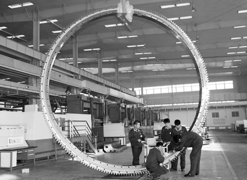 6月27日,为世界最大吨位取料机配套的外径11米轴承在瓦轴集团研制成功顺利下线,通过了国外客户验收,这是世界上首次将推力球轴承应用在大型堆取料机上。 2013年11月,在与国内外众多轴承企业同台竞争中,瓦轴成功承揽了为国外客户14400吨/小时取料机研制配套轴承的订单。 14400吨/小时取料机是目前世界上最大吨位的取料机,在大轴承的研发制造中,在没有现成经验的情况下,瓦轴集团完全依靠自己的技术力量和制造能力,实现了许多创新和突破,在中国轴承行业率先掌握了超大型轴承的核心技术,创造了12项中国第一:第一套国内最大尺寸推力球轴承;采用国际领先、国内首创的密封结构,实现轴承工作中的有效排削能力等。(兵工厂) |
