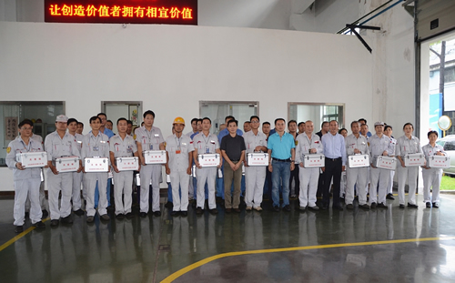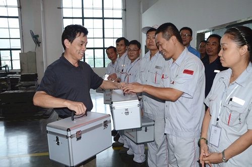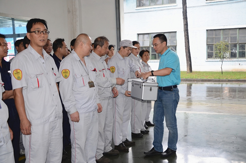 9月1日,东风商用车有限公司党委副书记、工会主席秦捷,党委委员、人事部部长毛长林,工会工作部部长戴勇等一行人冒着大雨,来到东风锻造有限公司,为一线共计41个直接生产班组和准直接生产班组送上了装有基本药品、医疗器具和日常用品的“关爱箱”。每个“关爱箱”内配置有电子血压计、云南白药、手电筒、针线包等多件用品,确保意外伤害发生时有急救药品,救治应急时有照明设备,工作服破损时有缝补针线,员工们都纷纷表示这项举措十分实用、贴心。