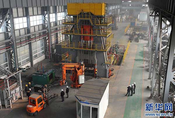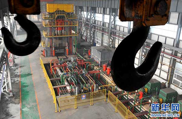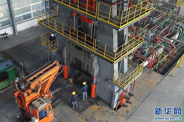 11月30日,在位于河北唐山高新区的二十二冶集团精密锻造有限公司精锻车间内,操作工在用1.2万吨多向模锻液压机锻压多向阀体。日前,由二十二冶集团精密锻造有限公司自主设计研发、自主制造的1.2万吨大型多向模锻件生产线正式投产。该项目总投资3.6亿元,于2012年启动,运用预应力钢丝缠绕新技术,攻克了大口径高温高压锻造阀门制造技术难题,具有精密、高效、低耗等技术优势,可广泛应用于航空、航天、核电、石油和化工等行业整体、大型、复杂零件的成形加工制造。