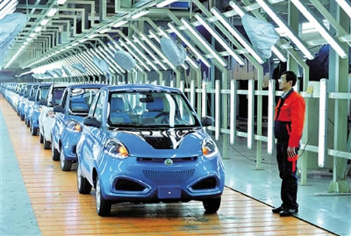 日前,新大洋电动车科技有限公司旗下首款纯电动汽车“知豆D1”在甘肃省兰州市兰州新区正式下线。据介绍,该车实现了百千米仅需8度电的超低能耗,续航里程达160千米。新大洋电动车科技有限公司由吉利控股集团与新大洋机电集团合资组建,其兰州生产基地目前已具备年产10万辆整车的能力。 图为工人在位于兰州新区的生产基地流水线上组装电动车。