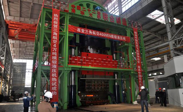 2012年3月3日,中国首台40000吨级模锻液压机,在西安阎良三角航空科技有限责任公司进行热试车,并顺利锻造出首个大型盘类件产品。该机是目前世界最大的单缸模锻液压机,采用钢丝缠绕预应力结构。