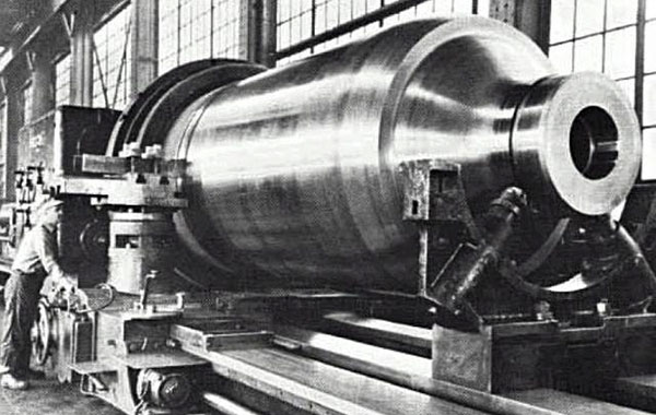1954年,美国梅斯塔(MESTA)公司为美国铝业制造的45000吨模锻水压机。 这是工人正在用110英寸(2.8米)镗铣床,对合金钢液压缸套筒进行加工。