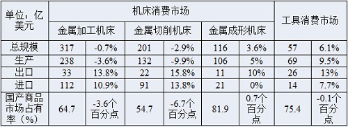 3.内外因交错,行业发展寻求新突破 通过对问卷中企业反映的突出问题和应对措施按重要度排序,可以发现影响当前企业运行的突出问题主要集中在以下六个方面: (1)市场需求不足(25.1%) (2)资金链紧张(13.4%) (3)人才缺失(12.8%) (4)内部成本过高(12.3%) (5)国外同类产品竞争(12.3%) (6)不公平竞争(7.5%) 当前企业采取的主要应对措施集中在以下八个方面: (1)控制成本(16.7%) (2)加强企业管理(14.5%) (3)加强细分市场开拓(12.4%) (4)加强产品质量控制(10.2%) (5)加大研发投入(10.2%) (6)减员增效(7.3%) (7)加强人才队伍建设(7.3%) (8)加大市场销售投入(5.5%) 按照问题导向的原则,以上反映出的突出问题和集中度较高的应对措施是下一步寻求行业发展突破和产业政策设计中给予重点关注的内容。 四、2014年运行预期 基于行业运行和进出口数据,结合调研情况分析,经综合测算预计2014年中国机床消费市场规模为317亿美元,同比下降0.7%;工具消费市场规模为57亿美元,同比增长6.1%(见表5)。 表5 2014年中国机床工具消费市场情况(预期)