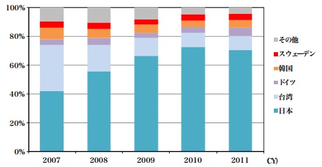 在中国产业机器人市场上,唱主角儿的是日本FANUC、安川电机、瑞士ABB以及德国KUKA等外资巨头,尤其是日系厂商的市场份额高达60%以上(上图蓝色部分为日系厂商份额),而国产厂商则显得黯淡无光,全部国产厂商加起来的份额也只占到10%左右。 |
