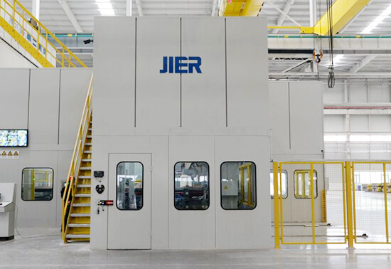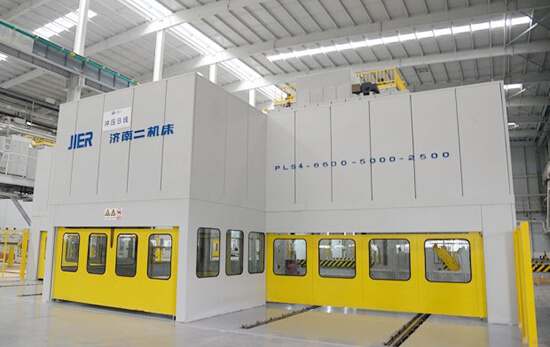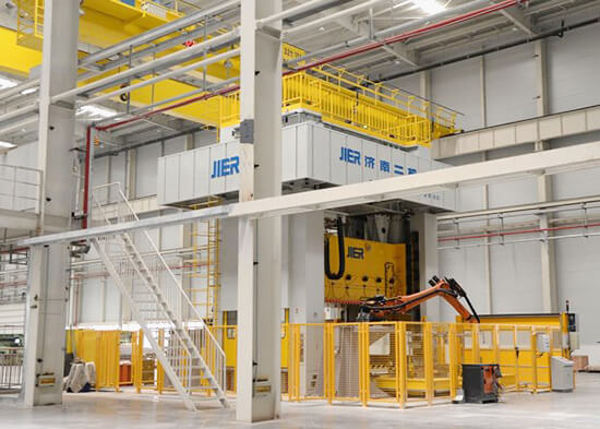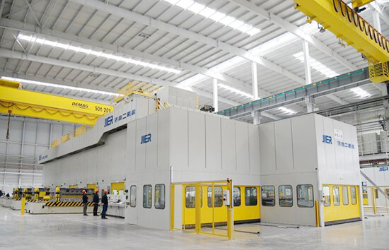 首先我们参观了该工厂的冲压车间,该车间共设计有两条冲压生产线、一条开卷落料线和一个模具修复线,均由济南二机床集团生产的JIER冲压机,目前该工厂仅启用了一条高速冲压生产线。