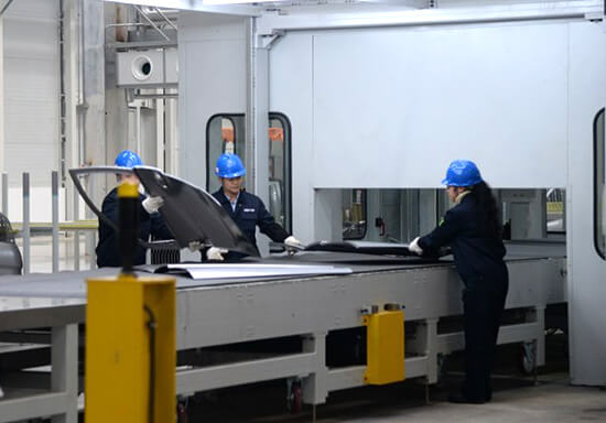 经过合车工位之后,接下来的其他的分装线还将为新车安装前后保险杠、车门轮胎等零部件,然后来到第一道检测工序——平行光检测漆面。