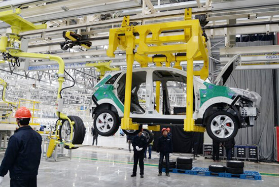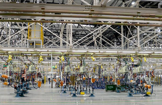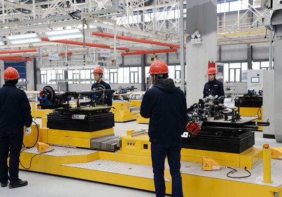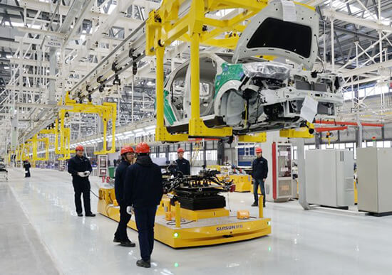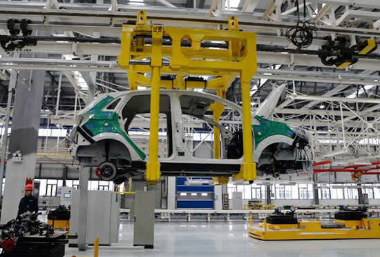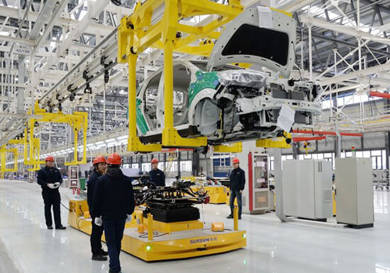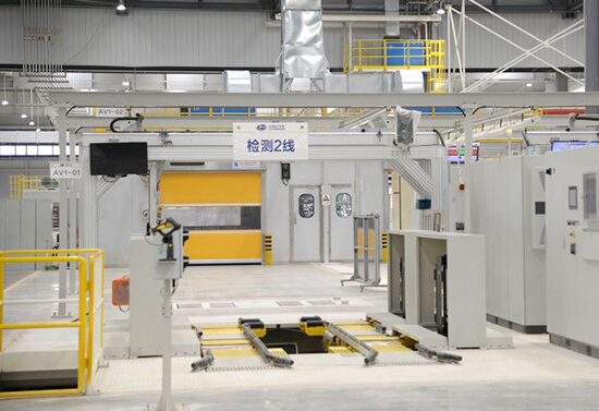 在合车工位上,由后桥分装生产线和副车架成产线组装的零件将由沈阳新松生产的AGV自动导引运输车运送至车体下方,从而方便零部件在不同工位上运输。