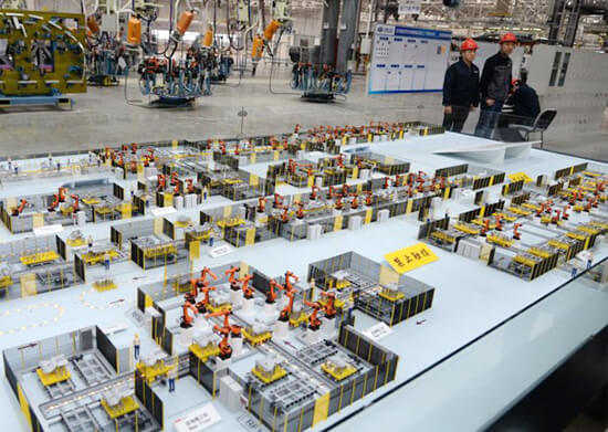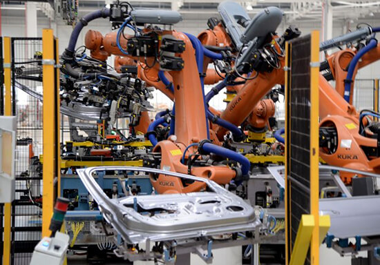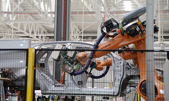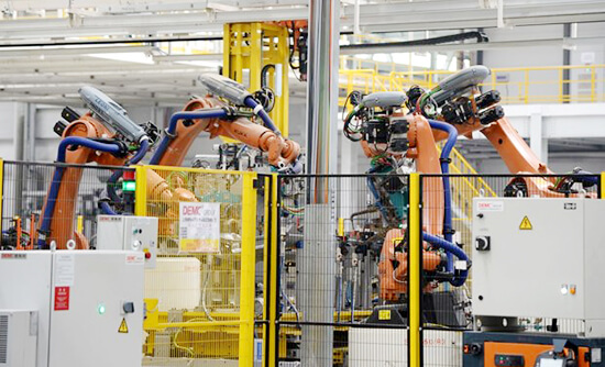 机器人焊接工位主要包括地板线、左右侧围线、车身主焊线,共配备有132台库卡机器人进行焊接作业。