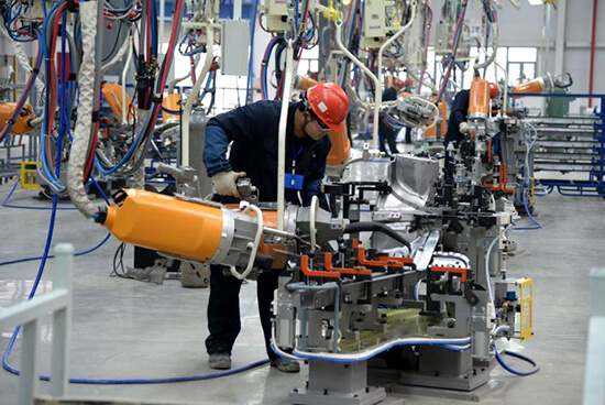 车辆零部件进入这里首先要进行人工焊接,包括底盘分总成和侧围小件等。在这里工人使用焊枪将小型零件进行人工焊接,使其组成发动机舱、后地板等大组件,然后送至机器人焊接工位进行进一步焊接。