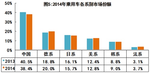 四、乘用车自主品牌市场份额下降 2014年,自主品牌乘用车销售757.33万辆,同比增长4.1%,占乘用车销售市场的38.4%,市场份额同比下降2.1个百分点。其中自主品牌轿车销售277.44万辆,同比下降17.4%,占轿车市场的22.4%,市场份额同比下降5.6个百分点。