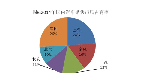 五、企业经济效益持续向好 2014年1~11月,17家重点企业(集团)累计完成工业总产值2.50万亿元,同比增长10.6%。累计实现主营业收入2.81万亿元,同比增长10.0%;完成利税总额4905.15亿元,同比增长8.6%。 六、大企业集团产业集中度进一步提高 2014年,6家汽车生产企业(集团)产销规模超过100万,其中上汽销量突破500万辆,达到558.37万辆,东风、一汽、长安、北汽和广汽分别达到380.25万辆、308.61万辆、254.78万辆、240.09万辆和117.23万辆。前6家企业(集团)2014年共销售汽车1859.33万辆,占汽车销售总量的79.2%,汽车产业集中度同比增长2.6%。