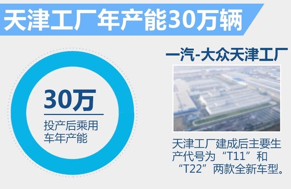 一汽-大众天津工厂项目预计2016年第一季度开工建设,于2018年第四季度建成投产,该项目总投资约194.8585亿元,工厂占地总面积达108.1公顷(hm2)。天津工厂建成后年产能可达30万辆/年,主要生产代号为“T11”和“T22”两款乘用车车型,其中年产“T11”型乘用车20万辆/年,年产“T22”型乘用车10万辆/年,这两款车极有可能是大众在华投产的两款全新车型。天津工厂投建的生产单元包括冲压车间、焊装车间、涂装车间和总装车间等,可独立完成整车制造所需的四大工艺。