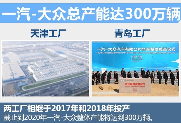 一汽大众此前公布的“2020战略”中,到2020年一汽-大众整体产能将达到300万辆。目前长春、成都、佛山三大生产基地也在进行项目扩建,建设完成后一汽-大众的总产能将有望达到210万辆/年。随着一汽-大众青岛工厂和天津工厂分别将于2017年和2018年实现建成投产,使一汽-大众形成覆盖东北、西南、华北、华南和华东的全国性战略布局,向“2020战略”目标的实现又迈进一步。