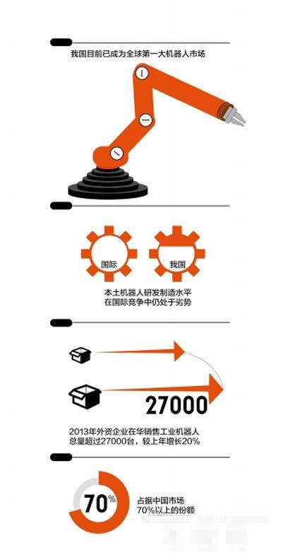 中国机器人行业正在经历井喷,截至2014年底,机器人相关企业数量已经超过4000家。中国正在成为全球机器人增长速度最快的市场。 机器人产业很热,但真正的机器人企业并不多,很多是玩机器人概念,这些企业大部分不是做机器人的。 正如沈阳新松机器人自动化股份有限公司中央研究院院长徐方介绍的一般,中国的机器人市场还处在玩概念的阶段,真正成熟并且具备竞争力的产品还很少,想跟机器人四大家族抗衡还颇有点鸡蛋碰石头的感觉。 瑞士ABB、日本发那科公司、日本安川电机、德国库卡机器人并称为机器人领域的“四大家族”,这些巨头占据中国机器人产业70%以上的市场份额,并且几乎垄断了机器人制造、焊接等高端领域