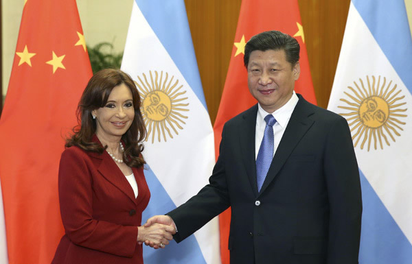 国家主席习近平4日在人民大会堂同阿根廷总统克里斯蒂娜举行会谈。 习近平指出,去年7月,我对阿根廷进行了成功的国事访问,我同你共同宣布建立中阿全面战略伙伴关系,就加强两国各领域互利友好合作达成重要共识。在双方共同努力下,我们达成的共识正在变为现实。中阿互利友好合作的新成果为两国关系发展注入了强劲动力。我对中阿关系前景更加充满信心。 习近平强调,中阿同为重要的新兴市场国家,双方应该密切交流合作,分享发展机遇,共同应对挑战。两国要加强全方位交往,发挥好两国政府间常设委员会的统筹协调作用,落实好两国政府共同行动计划。要深化务实合作,利用好经济合作与协调战略对话等机制,推动双方互利合作持续稳定深入发展。要建设好现有的铁路和水电站等重点项目,积极开展基础设施建设、农业、能源、矿产、装备制造等领域合作,将核电作为下阶段重点合作领域加以推进。要加强海关和质检交流,推动双边贸易健康稳定增长,继续加强金融合作,执行好本币互换协议。中方欢迎阿根廷企业积极开拓中国市场,将一如既往支持中国企业赴阿根廷投资兴业。中方愿同阿方加强在联合国、国际货币基金组织、二十国集团、七十七国集团加中国等国际组织和多边机制中的协作。