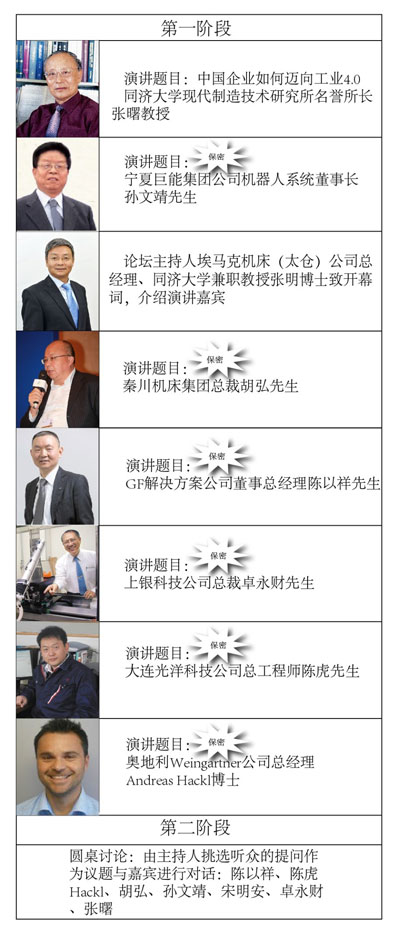 他们将在此次高峰论坛上发挥怎样的魔力,给中国制造业带来怎样的生机?大家拭目以待~ 他们已经吸引了众多制造业的大咖,例如:上海通用汽车有限公司,泛亚汽车技术中心有限公司,佛吉亚(青岛)排气系统有限公司,重庆长安汽车股份有限公司,上海汽车集团股份有限公司乘用车公司,标致雪铁龙中国技术中心,上海大众动力总成有限公司,一汽-大众汽车有限公司,大众汽车(中国)投资有限公司,大众一汽发动机(大连)有限公司,沈阳航天三菱汽车发动机制造有限公司,长城汽车长城汽车股份有限公司,华晨汽车工程研究院,浙江吉利动力总成有限公司,浙江吉利汽车研究院有限公司等100多家。 航空航天,船舶制造业,电子行业3C产品制造业,医疗机械制造业等共计200多家,届时有行业内权威媒体全部到场全程跟踪报道。 此次高峰论坛由CME中国机床展倾力打造,并落户于全球最大会展中心首场机床展会现场 时间:2015年3月25日-28日 地点:国家会展中心(上海虹桥) 规模:60000平方米 以下品牌全部参展:
