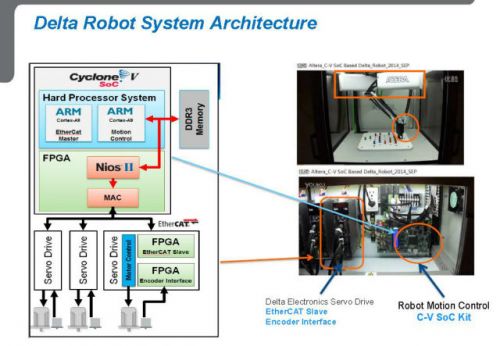 无论是德国率先提出的“工业4.0”概念,美国推行的“先进制造伙伴关系”计划,还是日本正在实施的“智慧制造系统”和中国工信部通过的“中国制造2025规划”,这些都指向同一个目标,那就是希望通过先进的IT与自动化技术来促进制造业的革新,以实现“智能化”,提升效率,降低成本。而要实现这个目标工业机器人是不可或缺的一环。 以前,工业机器人应用最为广泛的是汽车制造业;现在,工业机器人制造企业正努力向其他领域拓展。工业机器人制造企业也如雨后春笋般不断涌现,据统计仅去年中国国内差不多增加了200多加工业机器人制造厂商。对于工业机器人的市场前景,业界都是一致看好,普遍认为未来5~10年将会迎来工业机器人的一个爆发期。不过,要想在这一波浪潮中得益的话也并不容易。因为工业机器人涉及的系统相当复杂,仅核心零部件就包括了机械系统、控制器、伺服器和减速器等等。本刊就工业机器人的关键技术问题采访了一些半导体厂商,详细介绍了工业机器人当中的一些电子核心零部件。 控制器平台之争 在Altera公司亚太区工业业务部市场开发首席经理江允贵看来,有三个趋势在推动着工业自动化市场的蓬勃发展。 一是,提升能源效率,降低能源成本; 二是提升生产效率,这包括功能安全、生产线的稳定安全、保护操作人员的安全、以及机器损坏的降低和更长的生命周期和可靠度; 三是所谓的智能工厂。而只有前面两个因素达到后,才有可能实现智能工厂。他认为工业机器人是自动化里的很关键一部分。 江允贵拿智能工厂举例,他说现在一个典型的的智能工厂,从企业到工厂,以及工厂内如都是以工业以太网相连接的,他认为用工业以太网取代传统的以太网,主要是因为工业以太网的实时性更好。工业以太网可以连接主站和从站,连接主站中的PLC、PAC/运动控制器和HMI,和从站中的伺服器、I/O模块等等。 他进一步指出,其实工业机器人就是由这些关键零组件组合而成。由这些主站和从站可以组合成一个工业机器人,也可以做成一个CNC,CNC也是工厂自动化的一个关键。 虽然工业机器人可以看成是由上面的零组件组合而成,但具体到工业机器人里面的话也会有所不同。工业机器人的主要结构有机器人的控制器和伺服器。目前来说工业机器人有两轴、3轴的、最高也有7轴的。不过常用的是3~6轴的SCARA或Delta机械手臂。 由于中国是生产制造大国,由于缺工,智能手机和汽车制造商的需求,工业机器人市场增长非常迅速。江允贵表示,对于工业机器人的主控平台来说,一般都是以基于PC的X86的工控机为主,特别是在欧美工业机器人市场。一般在这样的X86平台上,FPGA是作为辅助存在的,主要充当加速的功能。在一个X86工控机主控平台上经常会出现多张PCI-E或PCI卡来实现多轴控制功能。不过这样的主控平台一般用于比较高端的工业机器人当中,因为它性能高,成本也高。 还有一种主控平台是用多核心的高端DSP为核心设计的,不过不是很常见的。 另外还有嵌入式主控平台。江允贵表示,目前Altera正在关注这部分的市场。他们希望可以使用单芯片就能实现工业机器人的控制,而不需要昂贵的X86平台再加上FPGA来做机器人的控制。 工业机器人的种类比较多,其最主要的功能有焊接、搬运、摆放、切割和喷漆等等。按照应用场景的不同,机器人的设计要求也会不一样,比如有的需要高速手臂、有的需要慢速、有的需要扭力大、有的需要很高的精密度等等不一而足。 “近期Altera就利用单颗SoC芯片制作出了一个快速、摆放型工业机器人参考设计方案。”江允贵这样对本刊记者表示。该工业机器人的主站控制平台由基于Cyclone V SoC的开发板实现。可以应用在生产线上,包括螺丝的摆放,饮食业中食品(方便面,糖果等)的摆放。对摆放型工业机器人来说,速度和精确度是最重要的参考指标,因为只有这样才能提高生产效率。“为达到高速和高精确度的指标,我们在这个参考设计中采用了目前最受欢迎的EtherCAT工业以太网。EtherCAT属于以太网,但经过我们改良物理层后,可以达到更好的实时性。”江允贵表示。 为了证明这个工业机器人的性能,他通过视频展示了该摆放型工业机器人在下跳棋、巡边和画圆周等运动方式。他认为这三个运动方式可以很明显地看出机器人的效能。