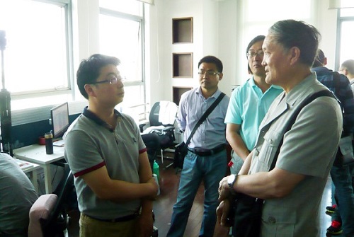 北京光学学会副理事长郭少陵(右)与实验室负责人 王扬博士(左)亲切交谈。 (北京光学学会 供稿) |