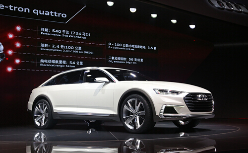 奥迪prologue allroad同时也是一款采用插电式混合动力的“e-tron”车型 自主开启“向上”模式 新能源正在升温 崔东树表示:本届车展是行业发展的风向标,一定程度上体现了自主自强的优势,今年的车市艰难,车企相对分化更严重,严峻的价格战竞争已经逐步启动。 自主品牌实现高端突破需要持续努力。本次车展的自主品牌纷纷推出高端轿车,包括东风一号豪华轿车亮相,广汽集团的高端轿车传祺GA8,江淮汽车的瑞风A60,众泰汽车的Z700等车型。“但公务车市场相对缩小,新品面临市场考验。豪华轿车国产化加速,高端下压的风险对自主品牌走高端仍是残酷的现实”。 在新能源方面,也是国内车企唱主角,很多新能源车的产品也在陆续走向市场。目前来看,A级轿车的电动化存在续航里程短板,消费者不认同购买价格、实用性稍差。而丰田等国际车企,并没有展示其努力推进的氢动力燃料电池车,反而希望主推A级混动车。欧洲车企在中大型车上,主推插电混动模式,包括宝马、奥迪和奔驰等品牌。