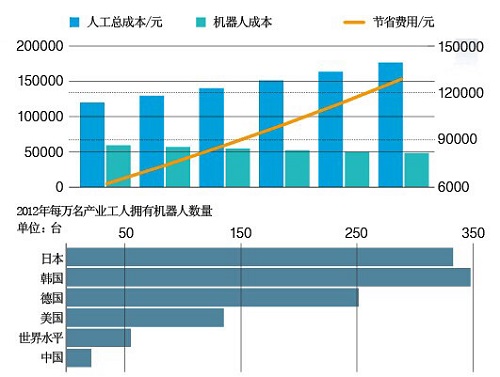 为什么需要机器人 中国已进入中等收入国家行列,劳动力成本的急剧上升倒逼企业转型。以浙江省为例,制造业人工成本近年来急剧攀升,已接近人均1万美元的水平线;“机器换人”之后,61.5%的企业至少减少10%的一线员工,其中16.3%的企业减少30%以上的一线员工。