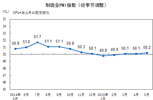 国家统计局发布数据显示,5月中国制造业采购经理指数为50.2%,前值50.1%。此前,各方普遍预期50.3%, 2015年5月份,中国制造业采购经理指数(PMI)为50.2%,比上月微升0.1个百分点,高于临界点,制造业小幅扩张。