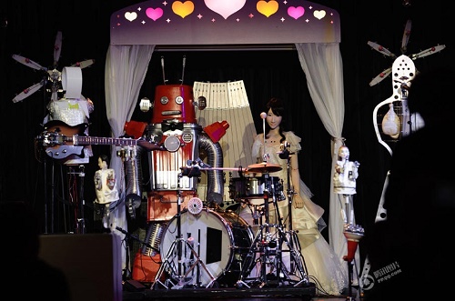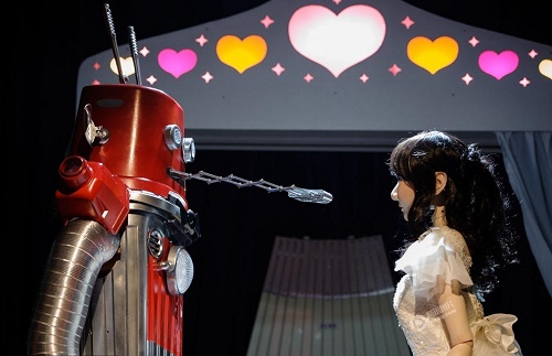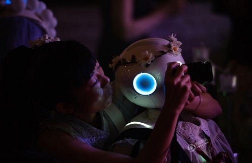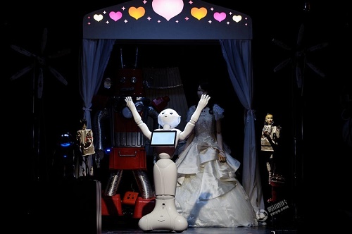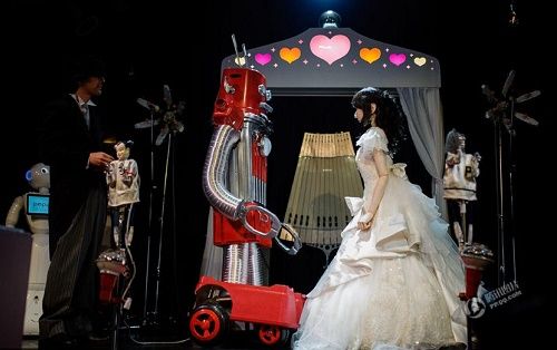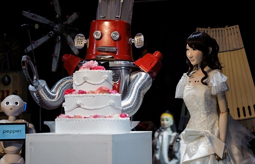 当地时间2015年6月27日,日本东京表参道,日本首个机器人婚礼在表参道的Cay咖啡馆举行。一对机器人在人类和众机器人的祝福下走向了婚姻殿堂。