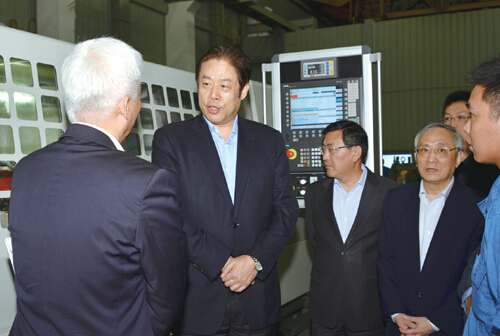 图为上海市政协主席吴志明(左二)一行赴上海机床厂视察调研高端机床研发制造情况,并就国家重大专项产品——双砂轮架数控切点跟踪曲轴磨床与技术人员进行了交流。