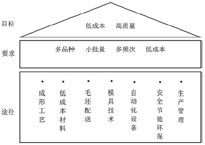 为了高效、优质、低成本地解决轿车冲压件生产问题,从冲压工艺角度要减少冲压件品种,生产时要减少批量增加批次;要提高生产节拍,减少生产转换时间。同时,要尽可能地采用国产板料及低成本板料。为了提高板料利用率,一方面要提高工艺及排样水平;另一方面要尽可能采用卷料,并且完成轻量化的激光拼焊板的准备。同时,为降低成本,在保证质量及工艺要求的前提下,要尽量减少投资。本文从工艺、材料、设备、模具等角度分析精益理念在具体生产中的应用。精益生产与冲压工艺的内在联系,如图1所示。