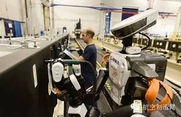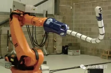 高度灵活的Snake Arm机器人 在行走机构方面,工业机器人大多采用轨道结构,占用工作空间和地面大,厂房投入和维护成本高。在轮式或履带式移动平台上安装工业机器人,从而达到围绕零件移动制造的目的不失为一种更经济的办法。利用真空吸附装置等实现工件表面攀附的爬行机器人也值得关注。 (4)协作化。双臂或多臂机器人越来越受到国内外众多科研机构的高度重视,ABB、KUKA、YASKAWA等国际知名机器人制造商纷纷开展了相关产品的研制,目前已经有利用双臂协调机器人进行航空复合材料自动铺放的报道。 另外,尽管机器人技术的发展日新月异,但毕竟不可能完全取代人,将机器人集成到生产中,使机器人与人并肩工作,消除人机之间的防护隔离,将人从简单枯燥的工作中解放出来,进而从事更有附加值的工作,一直是人们心目中最理想和最具吸引力的航空制造模式。2012 年底,德国、奥地利、西班牙等国家在欧盟第七框架计划“未来工厂”项目的资助下联合发起VALERI 计划,其目的就是实现机器人先进识别和人机协同操作。空客也在其飞机组装的未来探索(FUTURASSY)项目中做出了大胆尝试,将日本川田工业株式会社研制的人型双臂机器人应用于A380方向舵组装工作站,与普通人类员工一起进行铆接工作。