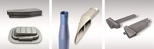 航空航天工业用钛零部件:舱门外围部件、外壳、支撑杆、散热器排气管、涡轮叶片(左起)