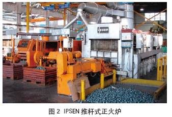 根据该产品的材料特性.在实施余热淬火过程中.重点要关注以下3 点: (1)实施严格的温度控制。在中频加热炉的出炉侧和淬火入水前安装了红外自动分选装置分别对加热温度和淬火温度进行在线检测确保这两个影响质量的参数稳定。 (2)适当的加热温度为了保证产品满足客户对产品冲击性能的要求选择合适的始锻温度非常重要始锻温度不宜过高.否则会导致坯料晶粒迅速长大.影响冲击性能:为此.对重复加热的坯料也要加以控制 。 (3)淬火介质的浓度控制。我们选择了PAG 淬火介质_这种介质的冷却特性介于水和油之间.既能解决油淬不易达到淬硬层深的问题又能避免水淬开裂倾向大的风险:当然.介质浓度的控制是保证淬火介质性能满足要求的关键。此外.须对淬火后的产品进行磁粉探伤检查控制淬火开裂产品漏出。 余热淬火工艺的实施为公司带来巨大成功.生产成本大幅降低让利于客户后公司的竞争力大大增强业务量持续增长。公司的效益也在不断提升。由于余热淬火工艺的开发应用使得公司的总体能耗大幅下降公司每万元产值消耗能源折合标煤的指标成为南京市行业准入的标准。企业不仅收获了经济效益_也为扩大社会效益作出贡献。 利用余热正火的生产实践 近年来.汽车工业在我国呈显出“井喷式”发展。家用轿车的需求带动了小汽车锻件的旺盛需求。我公司承接的汽车等速传动轴内、外星轮锻件.具有批量大、需求稳定的特点公司作为新的增长点给予重点关注。这类产品的材质为含碳量0.53 %的碳钢.为了保证良好的切削性能锻后要进行正火工序其最终热处理为渗碳淬火。现行工艺为采用两条IPSEN 推杆式正火炉(图2 )进行正火.正火质量稳定_产量也能满足要求。但是.随着时间推移.推杆炉能耗高_效率低的缺点正逐渐显现.并且由于正火高温产生的氧化皮致密厚实.喷丸清理的耗时也比较长.这些因素导致锻件生产的效益微薄.影响企业的综合竞争力。