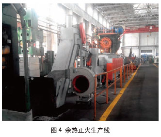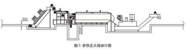 该余热正火生产线(图4 )的特点是:冲床冲孔完毕后的产品落在预冷传送带上_预冷传送带上的风机对工件进行预冷.风机的转速和传送带的输送速度可以调节.以控制进炉温度.在传送带的顶端装有温度分选装置.对过高或过低的锻件进行筛选.炉体长sm .功率为180kw 。炉内设有两个区.考虑产品进炉时有较高的初始温度.因此第一加热区相对较短.第二保温区比较长.以确保保温时间足够。后端是冷却传送带.风量可多级调整。