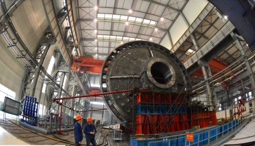 2016年1月4日,在中信重工生产车间,工作人员正加紧调试一台堪称“巨无霸”的大型半自磨机。 由中信重工自主研制的这台半自磨机,总重1241吨,有效容积512立方米,其综合性能已达到国际先进水平,将用于有“中国第一大金矿”之称的紫金山金矿。在元旦假期,工作人员对这台半自磨机的综合调试工作一刻没停,目前,调试工作已进入总装试机阶段。