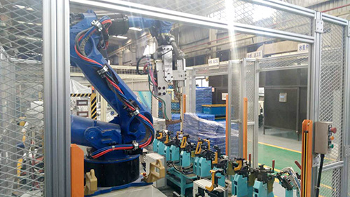4、机器人应用于冲床:由315T、250T、200T、200T四台冲床组成的冲压线,6台MH50机器人承担冲压件的工序间搬运,由PLC控制系统进行程序控制,达到冲压线自动化、连续化冲压。