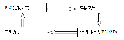 2、机器人点焊配置:机器人选用安川ES165D,焊机选用中频点焊机。为能满足多工位焊接的需要,我们设计了PLC控制系统来控制机器人、焊机、夹具的自动化焊接控制原理图。