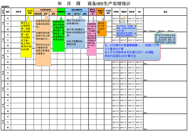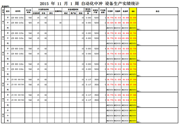 如何提高自动化设备的效率 怎样才能充分提高自动化设备的效率,是企业在引进了自动化设备所面临的首要问题。 一、从管理着力推进自动化设备效率提高 我们引进TPM全员、全生产、全过程设备管理模式,通过统计和计算设备效率(OEE)方法,来分析、总结、提高OEE, 1、自动化设备的(0EE)即是自动化设备的全面设备效率,其本质就是设备负荷时间内实际产量与理论产量的比值。是体现设备效率的重要的参考数据。计算公式:OEE= 时间开动率×性能开动率×合格品率×100%。 时间开动率 = 开动时间/负荷时间 性能开动率 = 净开动率×速度开动率 = 加工数量×理论加工周期/开动时间 合格品率 = 合格品数量/ 加工数量 2、为能确保统计数据的正确,首先成立了推进小组,制定了推进计划,规定统计标准,制定了统计表式,使OEE数据具有真实性和可比性。