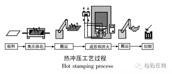 热冲压成形工艺是一种将热成形钢板加热到奥氏体温度,快速送入模具,快速冲压,在压机保压状态下通过模具内冷却系统(不是空气)、在一定的冷却速度下对零件进行淬火冷却,获得组织为马氏体,强度在1500MPa左右甚至更高的热成形冲压件的成形工艺。