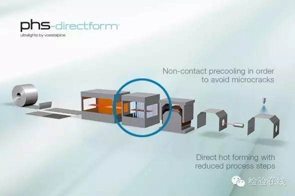 与其他成形工艺相比,板料的热冲压成形具有以下优点:变形抗力小、塑性好、成形极限高、易于成形;能够生产具有复杂几何形状的工件,成形零件具有良好的尺寸精度;配以合适的热处理方式,可使板料发挥其最佳的性能,为汽车提供高质量的零部件。 奥钢联宣称他们是世界上唯一一家同时拥有直接热冲压成型和间接热冲压成型技术的工厂: 奥钢联间接热冲压成型PHS-Ultraform:使用传统的冷成型工艺进行加工和切割,然后把冷成型的工件进行热处理,然后进行硬化和最终定型处理。 奥钢联直接热冲压成型PHS-Directform:该成型工艺是把硬化处理和最终定型处理一步完成,该工艺的关键之处在于在定型之前的预冷炉,把板卷预冷至550摄氏度左右然后再进行热冲压处理。