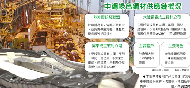中钢绿色钢材供应链概况 中钢热冲压部件已大量运用于汽车车体的保险杆、防撞梁、补强板等构件。图/中钢提供 中钢近来持续将节能减碳纳入中钢企业社会责任政策,更运用开放式创新,结合国内产学研界研发能量,致力高品级绿色钢材研发,并发展对应制造技术扩大绿色钢材使用,建构热冲压产业供应链,抢攻绿色商机。 中钢指出,钢铁产品可透过冶金设计及制程改善,不断地朝对环境有利方向精进品级,成为永续循环利用、用愈多愈环保的绿色材料。中钢强调,做为国内钢铁产业龙头,将持续扩大绿色钢材使用,发挥节能减碳重大贡献,包括热冲压汽车构件及BLDC马达等两项产业链的建立。 中钢表示,增加车体高强度钢材的使用量,可同时兼顾轻量化及安全性,已是世界各大车厂因应节能减碳采用的共同策略。在材料改成高强度钢时,如采传统冷冲压的加工制程,将遭遇不易加工与形状回弹等技术瓶颈,但热冲压成形技术,因可有效解决高强度钢材加工困难及成形回弹问题,热冲压部件已大量应用于汽车车体构件,如保险杆、防撞梁及补强板等。 而由于汽车热冲压零件使用比率持续增加,需求亦将快速成长,其市场发展潜力深受全球汽车产业关注。 中钢说,因热冲压设备投资成本高,加上无技术来源,以往国内业者及台商迟迟不敢投入开发;此项技术缺口除造成热冲压部件供应遭欧美厂商垄断,更大隐忧是台湾原先生产部品,也可能因无法供应热冲压部件而被进口KD件取代。 着眼于此,中钢于2011年12月推动筹组「热冲压研发联盟」,结合国内相关设备厂商及学研单位,合作进行技术开发,目前已建立完整热冲压技术。 此外,鉴于大陆深具热冲压汽车部件市场潜力,中钢于2014年1月与台商英利公司合作成立宏利汽车部件公司,分别于台湾屏东、中国长春同步建厂,并于2015年底完工投产。 该公司将台湾厂定位为营运总部、设计研发及制造中心,期能将核心技术根留台湾。中钢藉由热冲压关键技术开发,成功推动热冲压产业供应链建构,发挥产业凝聚效应,提升台湾汽车产业国际竞争力。