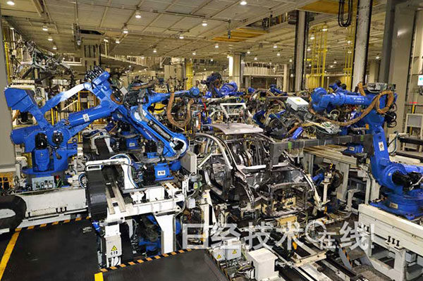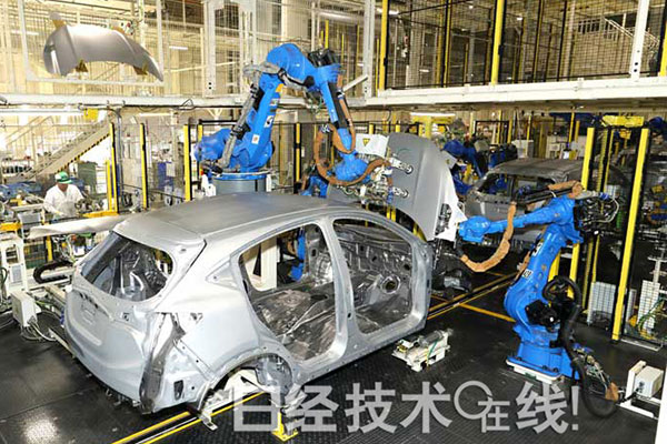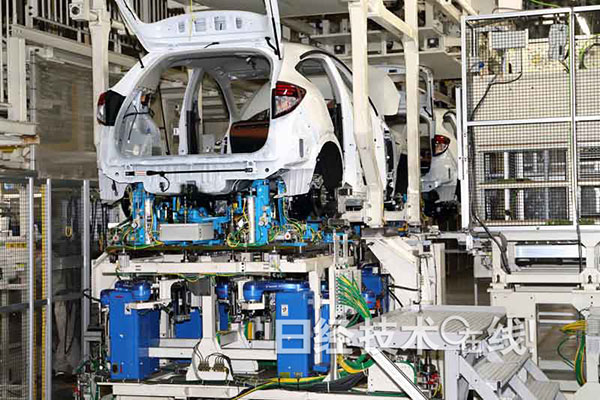 Inner GW工序 YASKAWA焊接机器人的焊接作业被设定为1台机器人约打12个焊点,总计打126个焊点。通过在狭小空间内让每台机器人多打焊点,将机器人数量从16台减少到了10台。通过采用上述两阶段的焊接工序,可优化点焊的打点作业,减少利用MIG(Metal inert Gas)焊接及螺钉紧固手段的加固工序,从而降低成本并实现轻量化。 在接下来的组装工序,工厂人员介绍了11处自动化工位中的部分工位。涂装工序后的车门拆卸以及向车身组装发动机罩等作业改用机器人来完成。并且,发动机及悬挂模块,乃至轮胎组装等的装配也都实现了自动化。