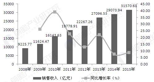 2008-2015年,我国汽车零部件制造业销售收入逐年增长,增速同样呈现波动下降的趋势。2015年,销售收入约为31570.61亿元,同比增长8.59%。 2008-2015年汽车零部件制造业销售收入走势图(单位:亿元,%)