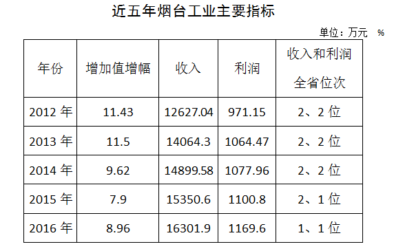 烟台是工业大市、民族工业的发祥地之一,工业规模总量位居全国大中城市、14个首批沿海开放城市、山东省17城市前列。多年来,烟台市委、市政府高度重视工业发展,积极应对经济新常态,以结构调整为主线,坚持走新型工业化道路,既在转方式中加快发展,又在调结构上提质增效,既抓好传统产业转型升级,又着力加快发展新兴高端产业,形成了门类齐全、优势突出的工业发展体系,工业成为支撑全市经济社会发展名副其实的主力军。 ——综合评比名列全省前茅。以评分全国地级市第一的成绩,被工信部提名为“全国工业稳增长和转型升级成效明显市”,并获得国务院表彰激励;获批全国首批消费品工业“三品”战略示范试点,成为全省唯一入围城市。 ——规模总量跃居全省首位。全市规模以上工业主营业务收入由2012年的1.25万亿元增加到1.63万亿元、跃居全国大中城市第8位、全省第1位,占全省的10.9%。今年1-7月,实现工业主营业务收入继续保持全省第1。 ——质量效益保持全省领先。规模以上工业实现利润由2012年的974亿元增加到2016年的1169.6亿元,跃居全省第1位,占全省的13.5%;万元GDP能耗0.33吨标准煤,约为全省平均水平的一半,成为首个地市级“国家绿色生态发展示范基地”。今年以来工业利润仍然保持全省第1。 ——支撑带动作用显著提升。规模以上工业提供了全市近5成的生产总值和税收收入;2016年带动全市生产总值达到6926亿元,占全省的10.3%。