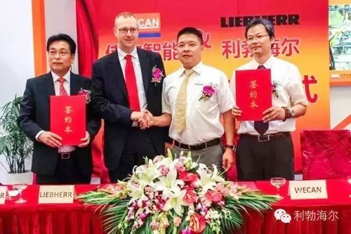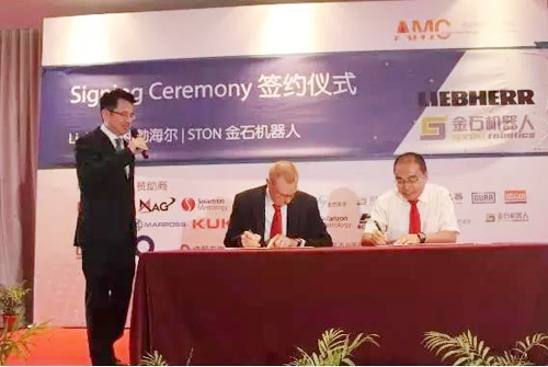 利勃海尔与金石机器人签订战略合作协议 在AMTS 2016展会次日,利勃海尔又与伟本智能在展会现场签订了战略合作协议,携手共同推动智能制造发展。